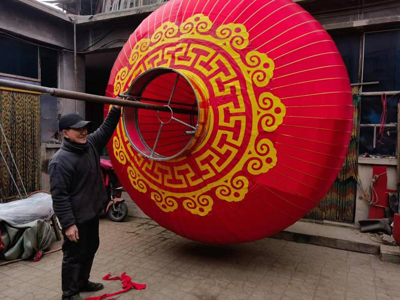 “這個(gè)規(guī)格是3米的,算是中等大小?!卑总娖绞炀毜?fù)伍_了一個(gè)大紅燈籠。打小跟老人學(xué)燈籠技藝,白軍平最擅長制作各種規(guī)格的大燈籠。