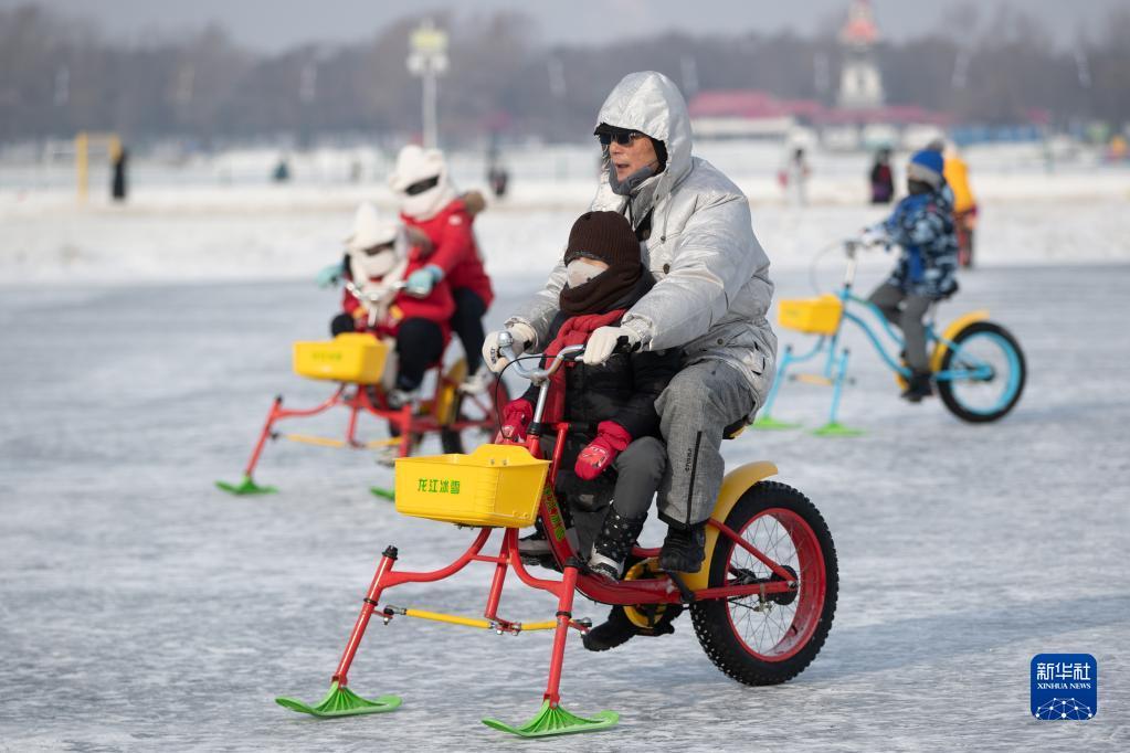 1月22日,游客在黑龍江省哈爾濱松花江冰雪嘉年華園區(qū)游玩。新華社記者 張濤 攝