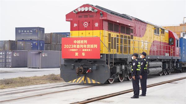 1月19日,一列滿載黑木耳、風(fēng)味蘑菇、糖果、啤酒等特色食品以及日用品等貨物的中越班列從南寧國際鐵路港駛出,預(yù)計(jì)24小時(shí)后到達(dá)越南安員站。這是今年以來的第7列中越班列,為東盟國家同慶春節(jié)送去滿滿年貨。