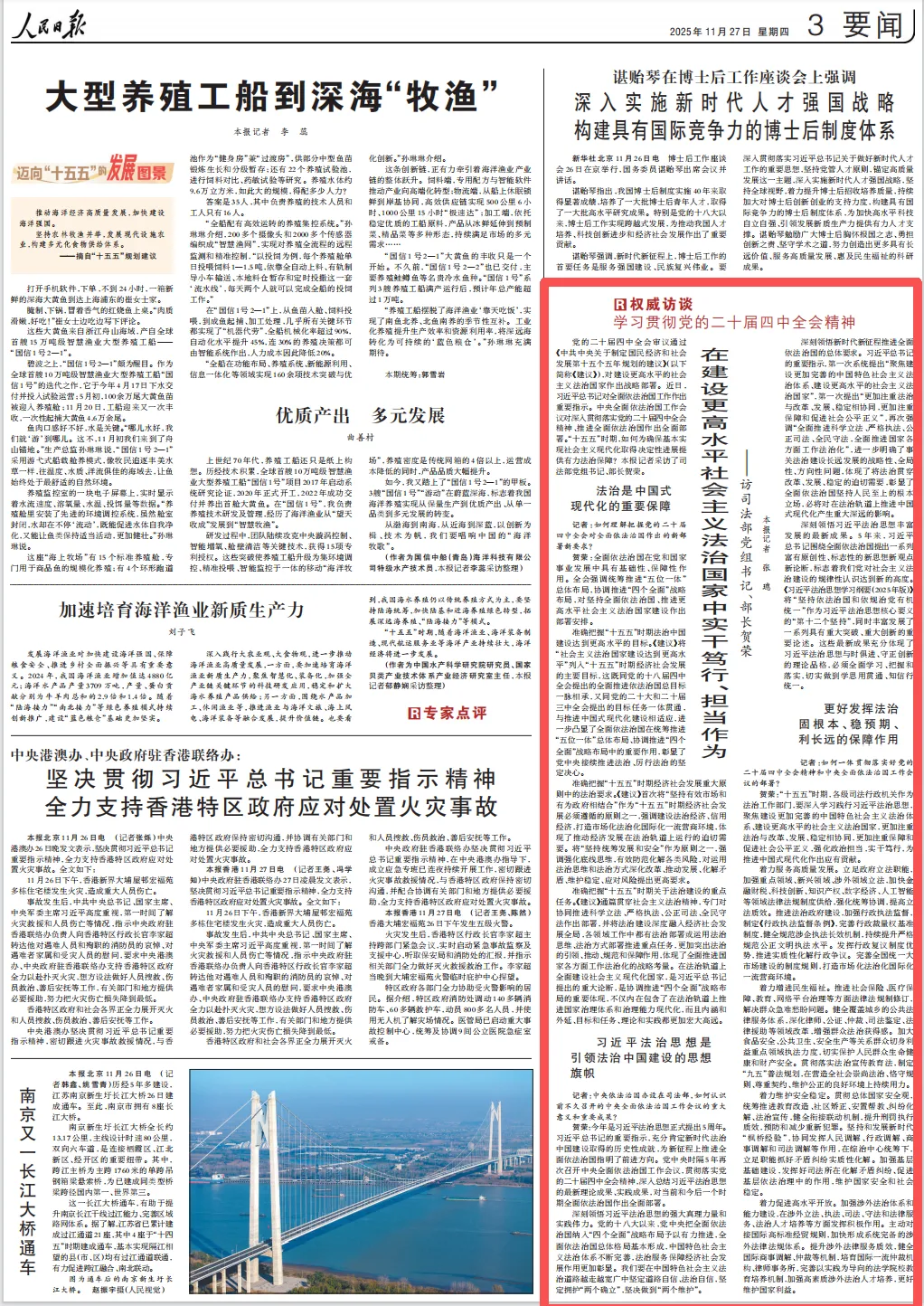 準(zhǔn)確把握“十五五”時(shí)期法治中國(guó)建設(shè)達(dá)到更高水平的目標(biāo)。《建議》將“社會(huì)主義法治國(guó)家建設(shè)達(dá)到更高水平”列入“十五五”時(shí)期經(jīng)濟(jì)社會(huì)發(fā)展的主要目標(biāo),這既同黨的十八屆四中全會(huì)提出的全面推進(jìn)依法治國(guó)總目標(biāo)一脈相承,又同黨的二十大和二十屆三中全會(huì)提出的目標(biāo)任務(wù)一體貫通,與推進(jìn)中國(guó)式現(xiàn)代化建設(shè)相適應(yīng),進(jìn)一步凸顯了全面依法治國(guó)在統(tǒng)籌推進(jìn)“五位一體”總體布局、協(xié)調(diào)推進(jìn)“四個(gè)全面”戰(zhàn)略布局中的重要作用,彰顯了黨中央接續(xù)推進(jìn)法治、厲行法治的堅(jiān)定決心。