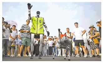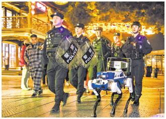 圖為杭州西湖斷橋上,西湖景區(qū)公安AI警隊(duì)隊(duì)員人形機(jī)器人協(xié)同機(jī)器狗同步現(xiàn)身。 王剛 攝