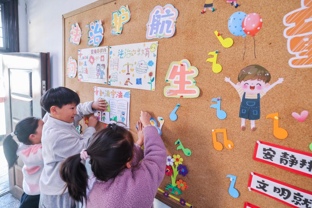 2025年12月9日,浙江省諸暨市暨南街道中心學(xué)校王家井小學(xué)的學(xué)生把自己創(chuàng)作的法治宣傳畫貼到教室的宣傳欄中。新華社記者 徐昱 攝