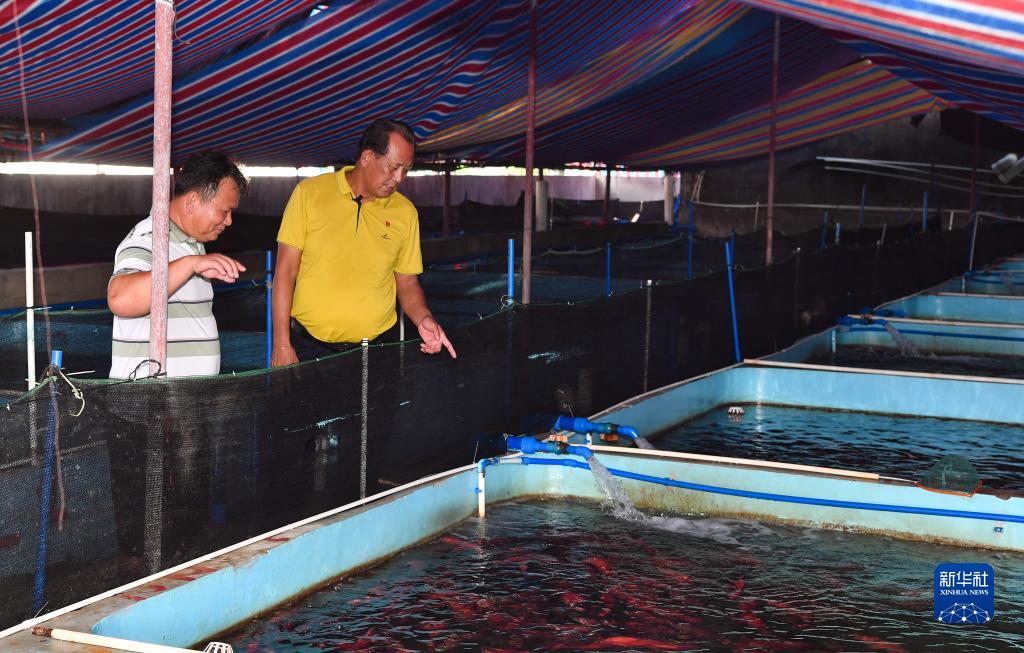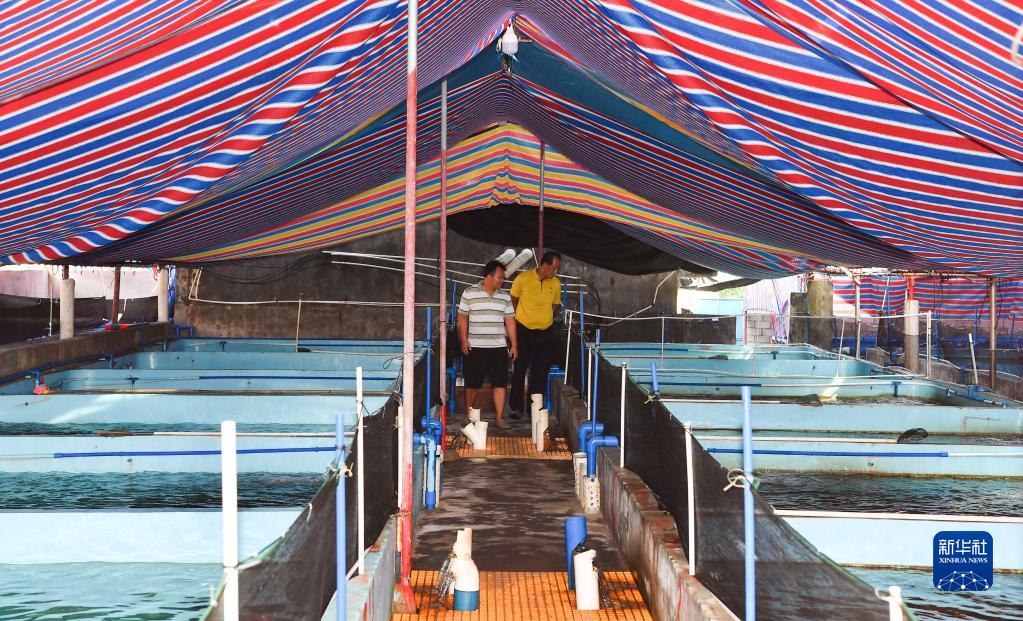 王書茂(右)在海南省瓊海市潭門鎮(zhèn)潭門村的一處養(yǎng)殖基地調研(9月14日攝)。新華社記者 楊冠宇 攝