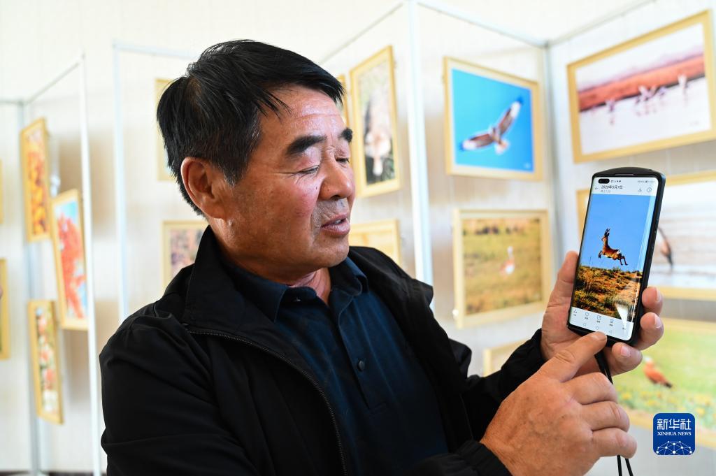 廷·巴特爾展示在自家草場拍攝的野生動物(9月8日攝)。新華社記者 劉磊 攝