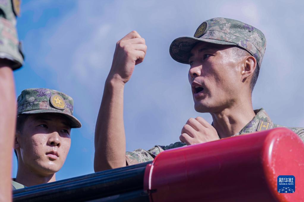 駐香港部隊某團(tuán)防空營營長王海旭(左)在訓(xùn)練中下達(dá)作戰(zhàn)指令(2022年7月21日攝)。新華社發(fā)(田越洋 攝)