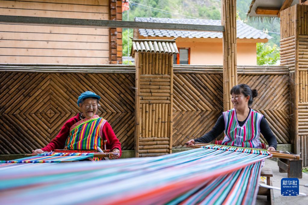 在云南省貢山獨(dú)龍族怒族自治縣獨(dú)龍江鄉(xiāng)迪政當(dāng)村,獨(dú)龍族老人李文仕(左)和女兒在編織獨(dú)龍?zhí)?2022年5月10日攝)。新華社記者 曹夢瑤 攝