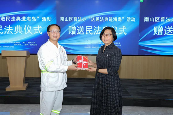 9月1日下午,廣東省深圳市司法局黨委副書記、副局長蔣小文,普法和依法治理處處長劉偉東,蛇口街道黨工委書記藍濤,南山區(qū)司法局局長康甲光一起,將一批民法典送到了位于前海蛇口水域的孖洲島。