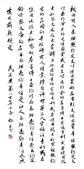 民法典第八百七十三條 被許可人未按照約定支付使用費的,應(yīng)當(dāng)補交使用費并按照約定支付違約金;不補交使用費或者支付違約金的,應(yīng)當(dāng)停止實施專利或者使用技術(shù)秘密,交還技術(shù)資料,承擔(dān)違約責(zé)任;實施專利或者使用技術(shù)秘密超越約定的范圍的,未經(jīng)許可人同意擅自許可第三人實施該專利或者使用該技術(shù)秘密的,應(yīng)當(dāng)停止違約行為,承擔(dān)違約責(zé)任;違反約定的保密義務(wù)的,應(yīng)當(dāng)承擔(dān)違約責(zé)任。
