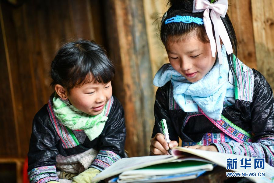 2月25日,貴州省從江縣丙妹鎮(zhèn)大歹小學(xué)的學(xué)生潘污簡(jiǎn)(右)與堂妹在家里做寒假作業(yè)。新華社記者 楊文斌 攝