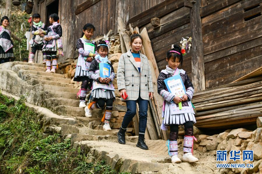 2月25日,在貴州省從江縣丙妹鎮(zhèn)大歹村,大歹小學(xué)的學(xué)生和老師蒙慧蓮(右二)在家訪途中。新華社記者 楊文斌 攝