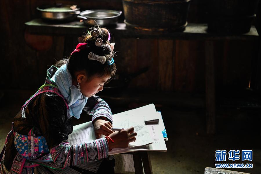 2月25日,貴州省從江縣丙妹鎮(zhèn)大歹小學(xué)的學(xué)生潘污簡(jiǎn)在家里做寒假作業(yè)。新華社記者 楊文斌 攝