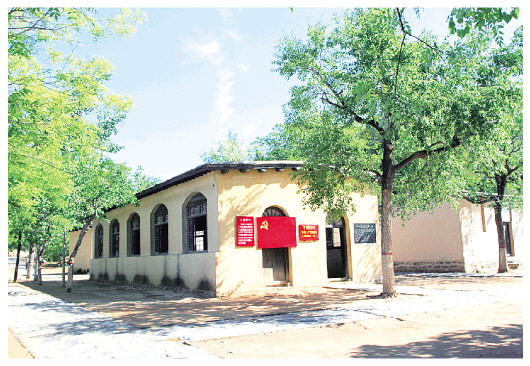 走進(jìn)會(huì)場(chǎng),只見(jiàn)正面掛著一塊絳紫色的幕布,幕布上懸掛兩面繡有“中國(guó)共產(chǎn)黨”字樣的黨旗,黨旗上方是毛澤東和朱德的兩幅畫(huà)像,會(huì)場(chǎng)兩側(cè)的白墻上懸掛著四面黨旗。