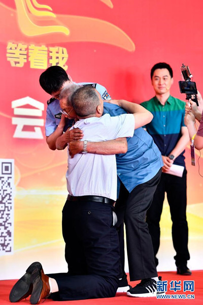 6月8日,在“認(rèn)親,我們在行動”濟(jì)南主會場,張某(左)和吳某林(右)擁抱著被拐的兒子。新華社記者 郭緒雷 攝