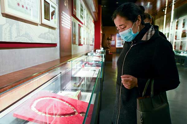 2021年4月3日,在烏魯木齊市革命烈士陵園,瑪依努爾看著愛人艾熱提的獎?wù)孪萑肷钏肌P氯A社記者 王菲 攝