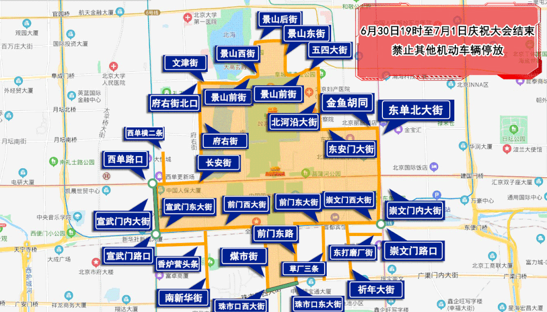6月30日19時(shí)至7月1日慶祝大會(huì)結(jié)束,由府右街北口經(jīng)府右街、長(zhǎng)安街、西單路口(不含)、宣武門內(nèi)大街(不含)、宣武門路口(不含)、宣武門東大街、前門西大街、煤市街、珠市口西大街(不含)、珠市口東大街(不含)、前門東路、前門東大街、崇文門西大街、崇文門路口(不含)、崇文門內(nèi)大街、東單北大街、金魚胡同、東安門大街、北河沿大街、五四大街、景山前街、景山東街、景山后街、景山西街、景山前街、文津街至府右街北口以內(nèi)區(qū)域、西單橫二條、祈年大街、東打磨廠街、南新華街、香爐營頭條、草廠三條、前門肯德基停車場(chǎng),除持有慶祝大會(huì)專用證件的車輛外,禁止其他機(jī)動(dòng)車輛停放。