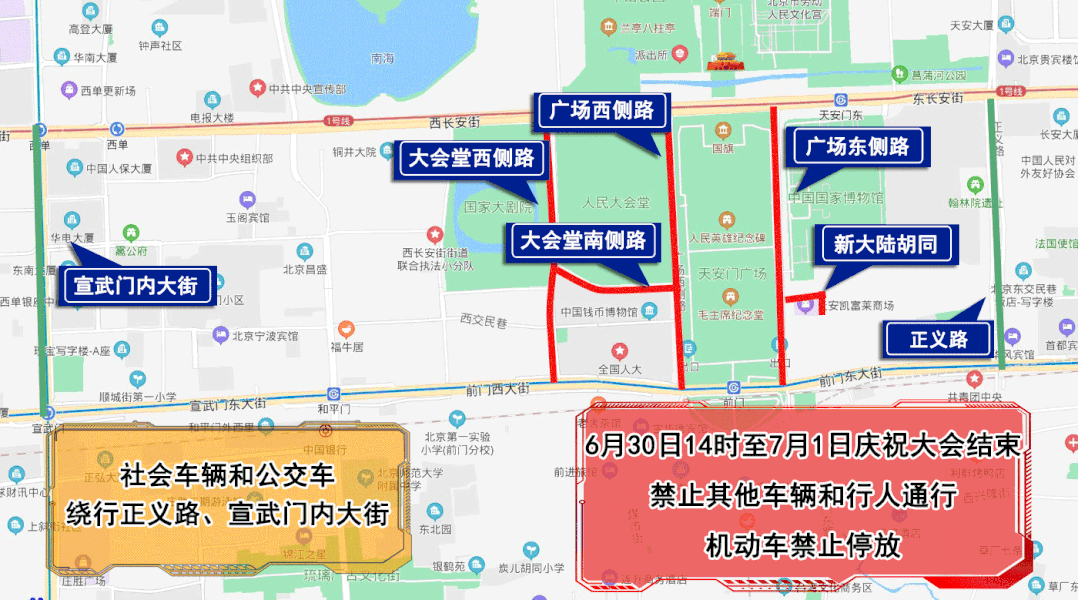 6月30日14時(shí)至7月1日慶祝大會(huì)結(jié)束,人民大會(huì)堂西側(cè)路、人民大會(huì)堂南側(cè)路、天安門廣場(chǎng)東側(cè)路、天安門廣場(chǎng)西側(cè)路、新大陸胡同,除持有慶祝大會(huì)專用證件的車輛和人員外,禁止其他車輛和行人通行,機(jī)動(dòng)車禁止停放。社會(huì)車輛和公交車經(jīng)正義路、宣武門內(nèi)大街繞行。