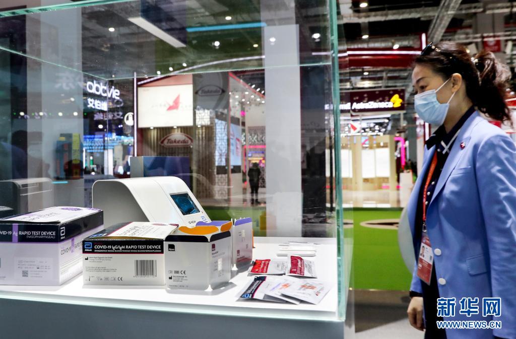 在第三屆中國國際進(jìn)口博覽會公共衛(wèi)生防疫專區(qū),參觀者觀看雅培展示的便于攜帶且適用于大規(guī)模檢測的新冠病毒快速抗原檢測試劑和產(chǎn)品(2020年11月5日攝)。新華社記者 劉穎 攝