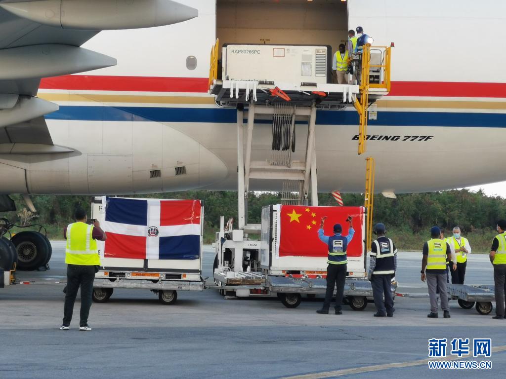 這是2021年3月17日,運(yùn)載中國援助的新冠疫苗等物資的飛機(jī)抵達(dá)多米尼加首都圣多明各。新華社發(fā)(中國駐多米尼加大使館供圖)