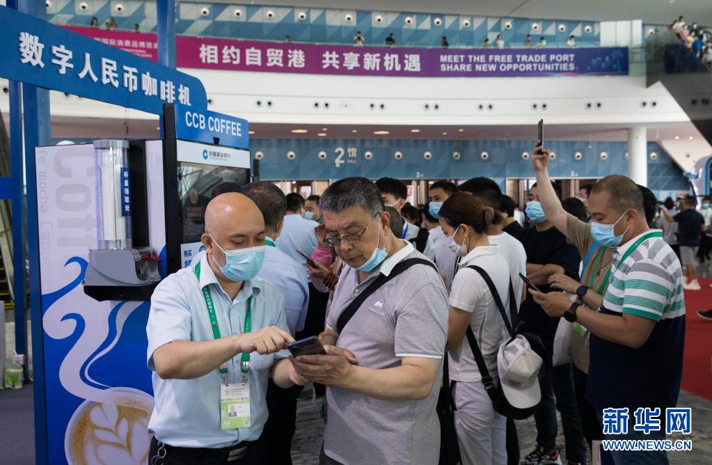 在??谂e行的首屆中國國際消費(fèi)品博覽會上,參觀者體驗(yàn)數(shù)字人民幣咖啡機(jī)(2021年5月10日攝)。新華社記者 金立旺 攝