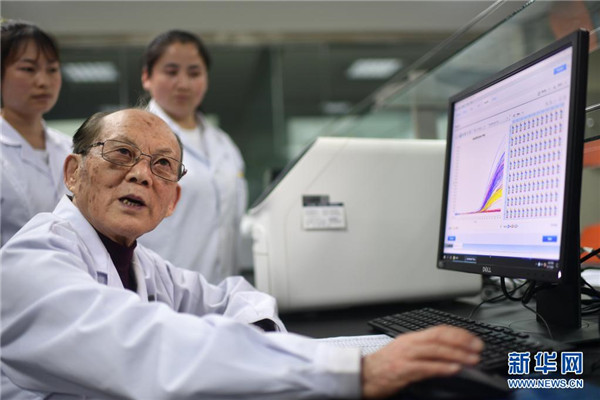 6月17日,吳天一(右二)在青海西寧的實(shí)驗(yàn)室內(nèi)指導(dǎo)學(xué)生。新華社記者 張宏祥 攝