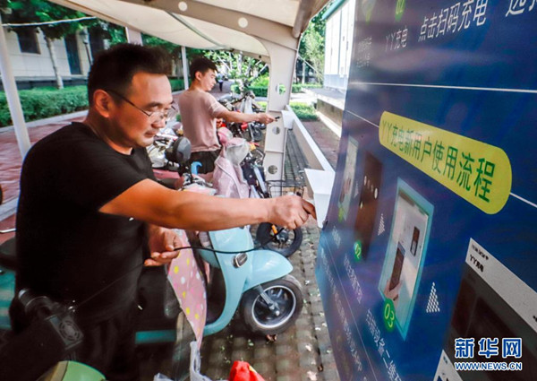 8月1日,業(yè)主在河北省遵化市一住宅小區(qū)電動車集中停放處充電。