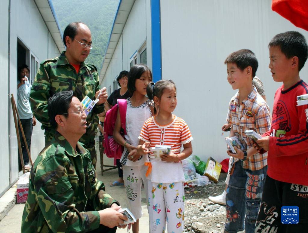 2008年“六一”兒童節(jié)當天,援川干部崔學選(前左)在北川縣桂溪鄉(xiāng)看望受災兒童。新華社發(fā)