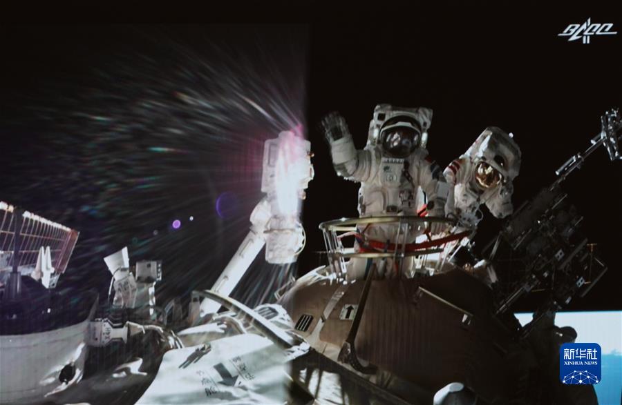 8月20日在北京航天飛行控制中心大屏拍攝的神舟十二號乘組航天員聶海勝、劉伯明在出艙任務(wù)結(jié)束后揮手示意。新華社記者 田定宇 攝