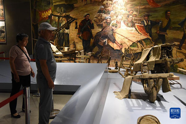 在位于山東省臨沂市蒙陰縣的孟良崮戰(zhàn)役紀(jì)念館,游客參觀孟良崮戰(zhàn)役期間使用過的小推車(2019年6月9日攝)。新華社記者 王凱 攝