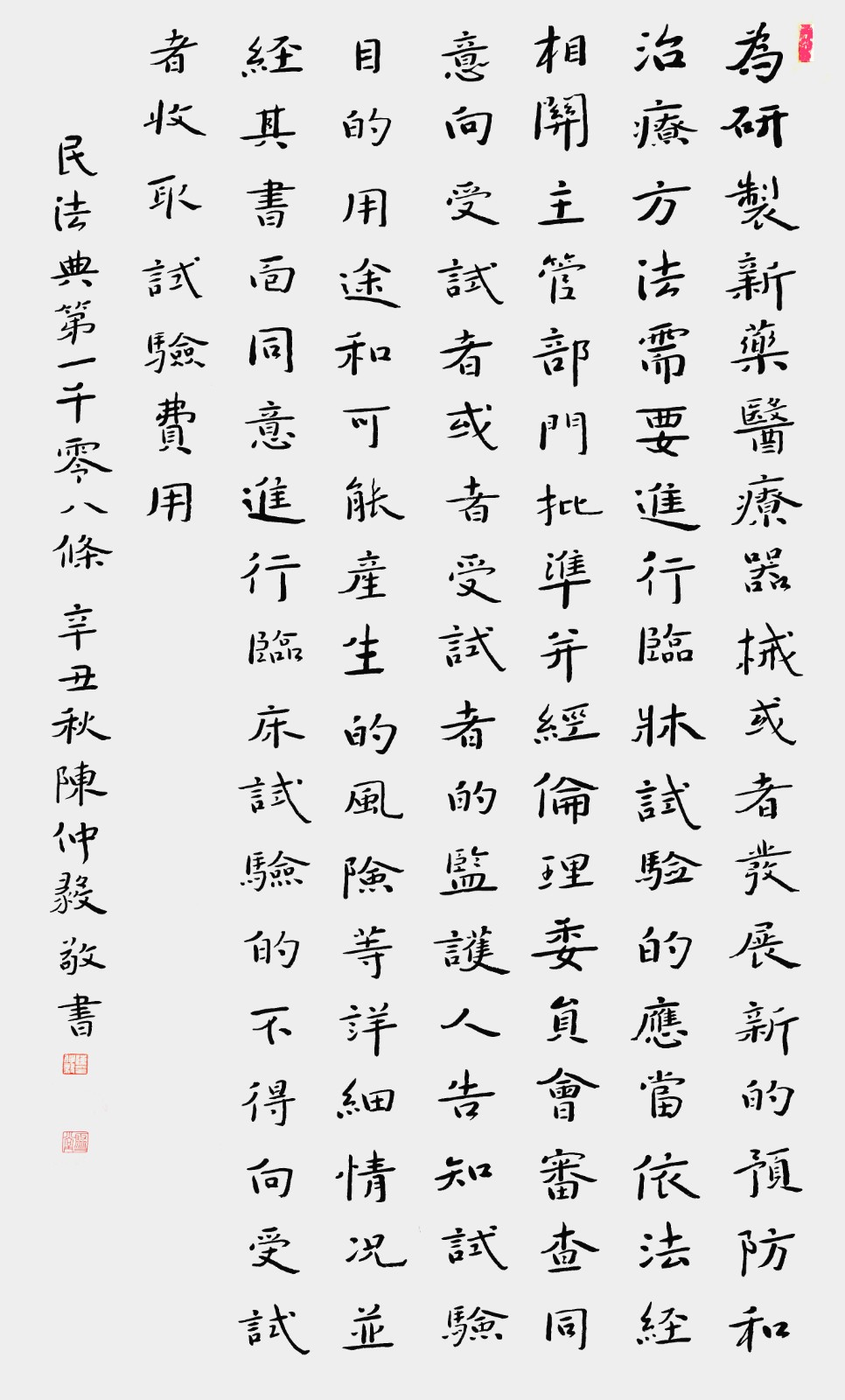 民法典第一千零八條 為研制新藥、醫(yī)療器械或者發(fā)展新的預(yù)防和治療方法,需要進(jìn)行臨床試驗(yàn)的,應(yīng)當(dāng)依法經(jīng)相關(guān)主管部門批準(zhǔn)并經(jīng)倫理委員會(huì)審查同意,向受試者或者受試者的監(jiān)護(hù)人告知試驗(yàn)?zāi)康摹⒂猛竞涂赡墚a(chǎn)生的風(fēng)險(xiǎn)等詳細(xì)情況,并經(jīng)其書(shū)面同意。