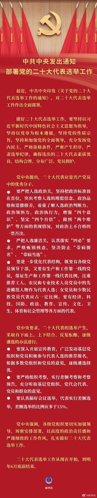 二十大代表選舉工作從現(xiàn)在開始,到明年6月底前結(jié)束。