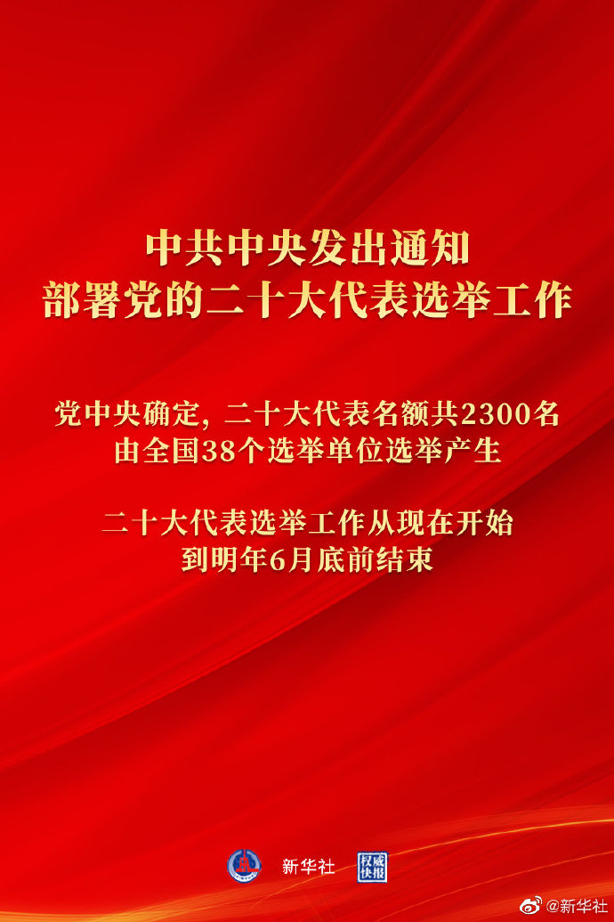 黨中央確定,二十大代表名額共2300名,由全國38個選舉單位選舉產(chǎn)生。做好二十大代表選舉工作,要堅持以習(xí)近平新時代中國特色社會主義思想為指導(dǎo),堅持以黨章為根本遵循,堅持黨的性質(zhì)宗旨,堅持和加強黨的全面領(lǐng)導(dǎo),充分發(fā)揚黨內(nèi)民主,嚴(yán)格資格條件,嚴(yán)密產(chǎn)生程序,嚴(yán)肅選舉紀(jì)律,確保選出的二十大代表素質(zhì)優(yōu)良、結(jié)構(gòu)合理、分布廣泛、黨員擁護。