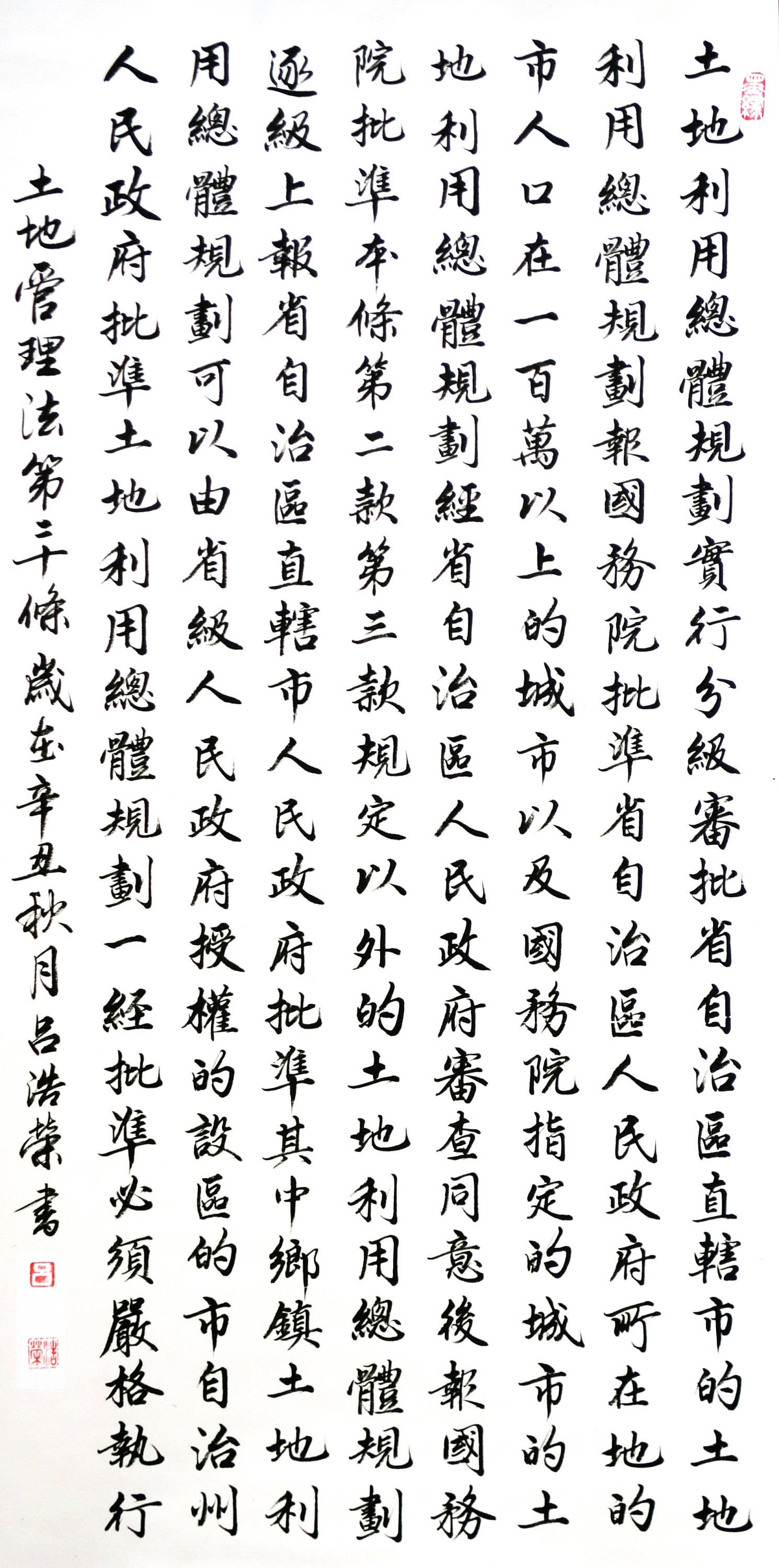 繼1600余位書法家參與書寫《中華人民共和國民法典》全部1260條法條之后,法治日報社聯(lián)合自然資源部法規(guī)司、自然資源部書畫研究會和北京昌平書法家協(xié)會,將筆端對準(zhǔn)土地管理“一法一條例”,即《中華人民共和國土地管理法》和《中華人民共和國土地管理法實(shí)施條例》。