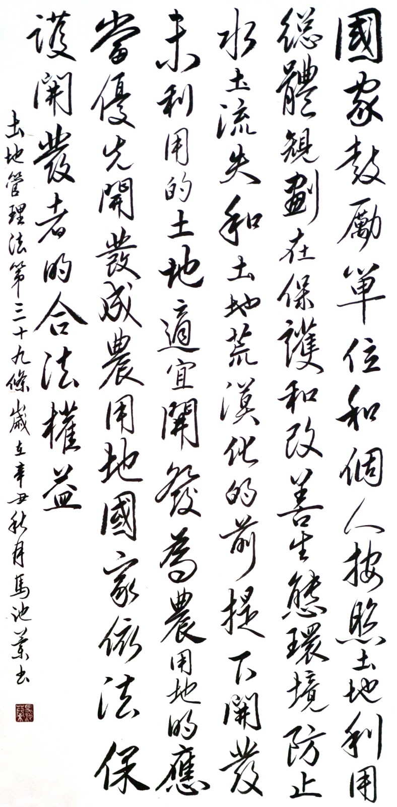 繼1600余位書法家參與書寫《中華人民共和國(guó)民法典》全部1260條法條之后,法治日?qǐng)?bào)社聯(lián)合自然資源部法規(guī)司、自然資源部書畫研究會(huì)和北京昌平書法家協(xié)會(huì),將筆端對(duì)準(zhǔn)土地管理“一法一條例”,即《中華人民共和國(guó)土地管理法》和《中華人民共和國(guó)土地管理法實(shí)施條例》。