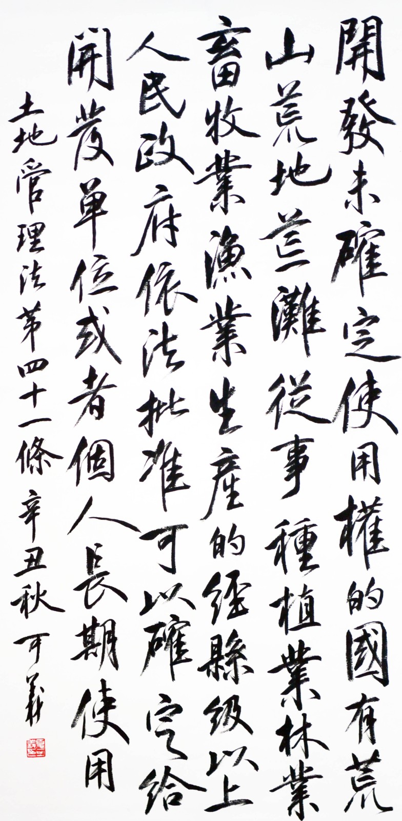 繼1600余位書法家參與書寫《中華人民共和國民法典》全部1260條法條之后,法治日報社聯(lián)合自然資源部法規(guī)司、自然資源部書畫研究會和北京昌平書法家協(xié)會,將筆端對準土地管理“一法一條例”,即《中華人民共和國土地管理法》和《中華人民共和國土地管理法實施條例》。