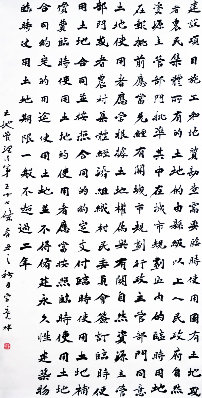 繼1600余位書(shū)法家參與書(shū)寫(xiě)《中華人民共和國(guó)民法典》全部1260條法條之后,法治日?qǐng)?bào)社聯(lián)合自然資源部法規(guī)司、自然資源部書(shū)畫(huà)研究會(huì)和北京昌平書(shū)法家協(xié)會(huì),將筆端對(duì)準(zhǔn)土地管理“一法一條例”,即《中華人民共和國(guó)土地管理法》和《中華人民共和國(guó)土地管理法實(shí)施條例》。