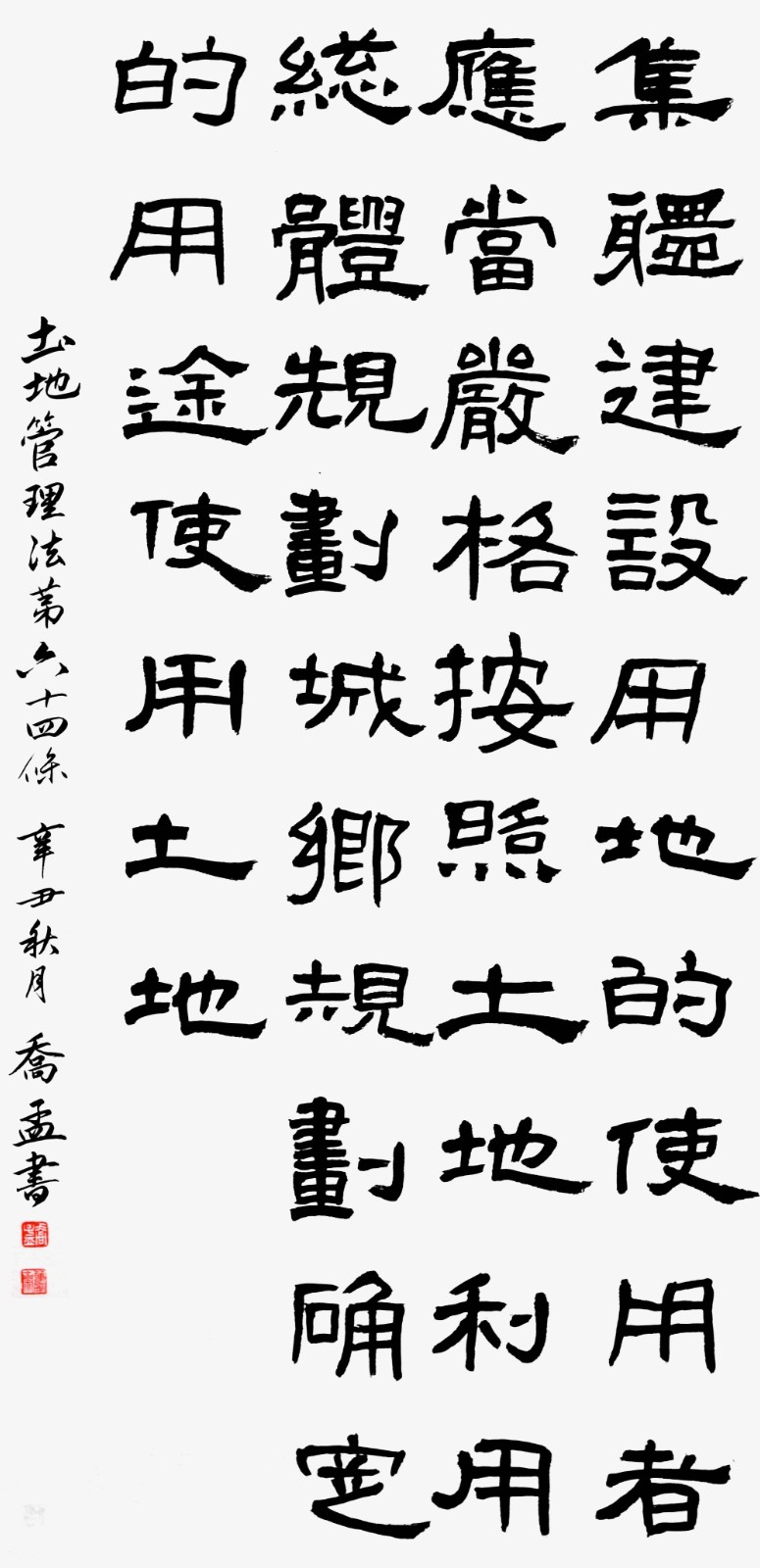繼1600余位書法家參與書寫《中華人民共和國民法典》全部1260條法條之后,法治日報社聯(lián)合自然資源部法規(guī)司、自然資源部書畫研究會和北京昌平書法家協(xié)會,將筆端對準土地管理“一法一條例”,即《中華人民共和國土地管理法》和《中華人民共和國土地管理法實施條例》。