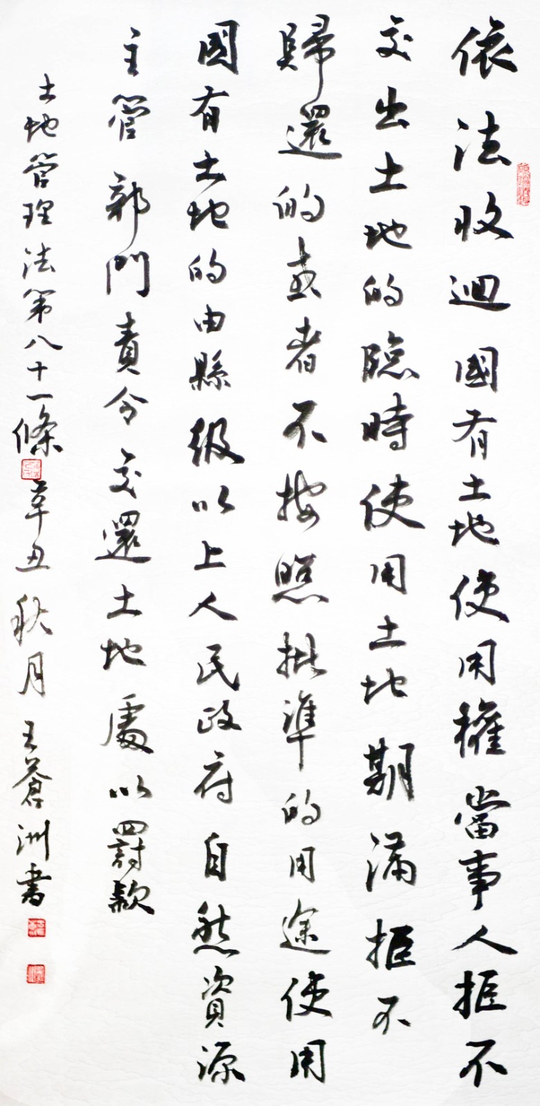 繼1600余位書法家參與書寫《中華人民共和國民法典》全部1260條法條之后,法治日報社聯(lián)合自然資源部法規(guī)司、自然資源部書畫研究會和北京昌平書法家協(xié)會,將筆端對準(zhǔn)土地管理“一法一條例”,即《中華人民共和國土地管理法》和《中華人民共和國土地管理法實施條例》。