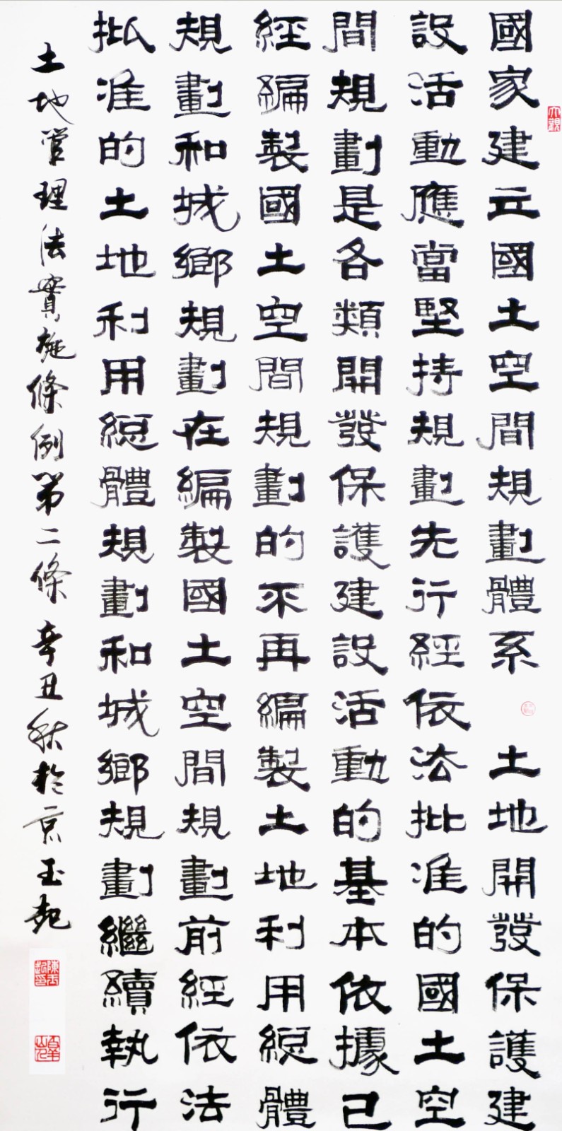 繼1600余位書法家參與書寫《中華人民共和國民法典》全部1260條法條之后,法治日報社聯(lián)合自然資源部法規(guī)司、自然資源部書畫研究會和北京昌平書法家協(xié)會,將筆端對準(zhǔn)土地管理“一法一條例”,即《中華人民共和國土地管理法》和《中華人民共和國土地管理法實施條例》。