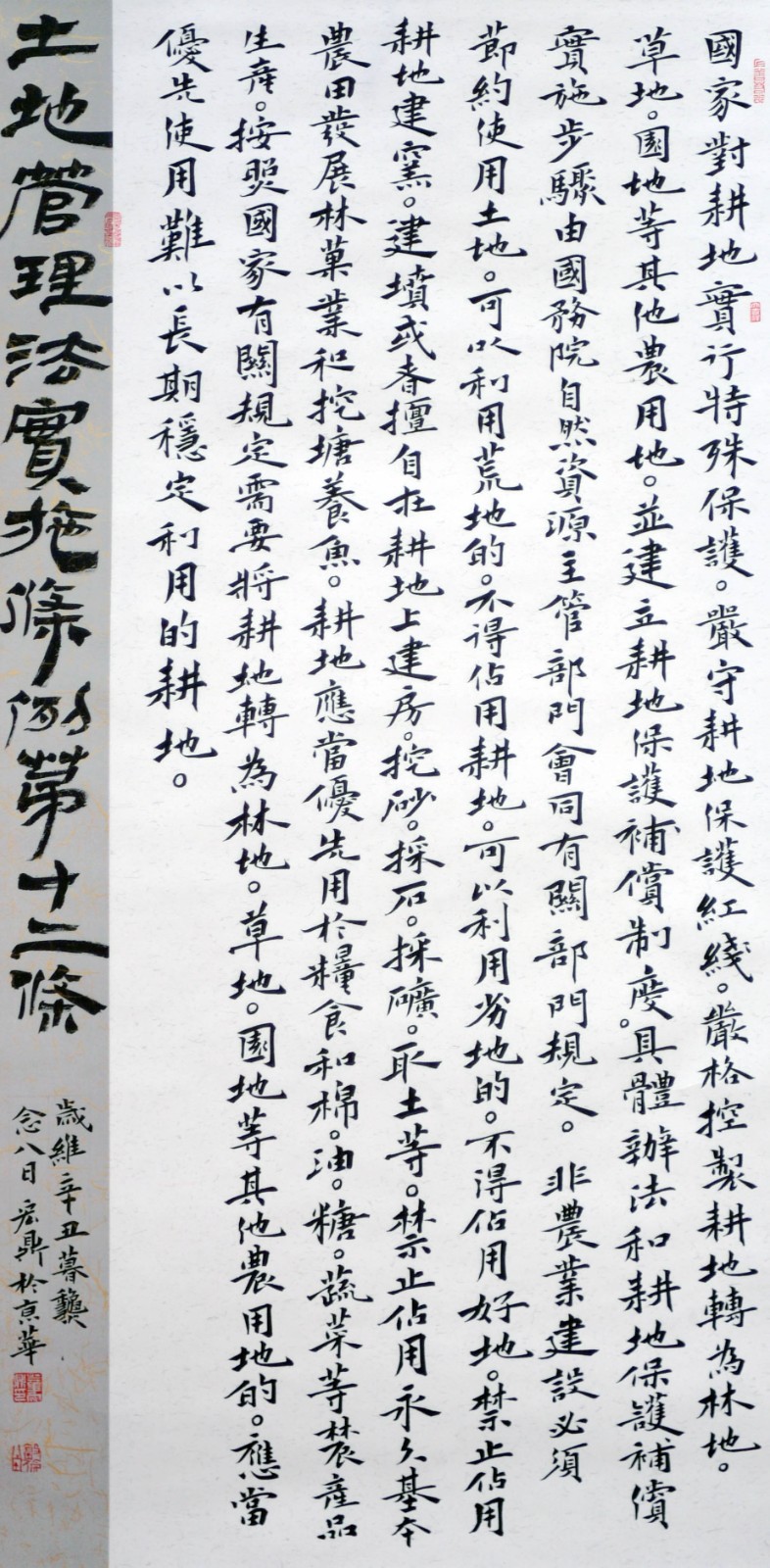 繼1600余位書法家參與書寫《中華人民共和國(guó)民法典》全部1260條法條之后,法治日?qǐng)?bào)社聯(lián)合自然資源部法規(guī)司、自然資源部書畫研究會(huì)和北京昌平書法家協(xié)會(huì),將筆端對(duì)準(zhǔn)土地管理“一法一條例”,即《中華人民共和國(guó)土地管理法》和《中華人民共和國(guó)土地管理法實(shí)施條例》。