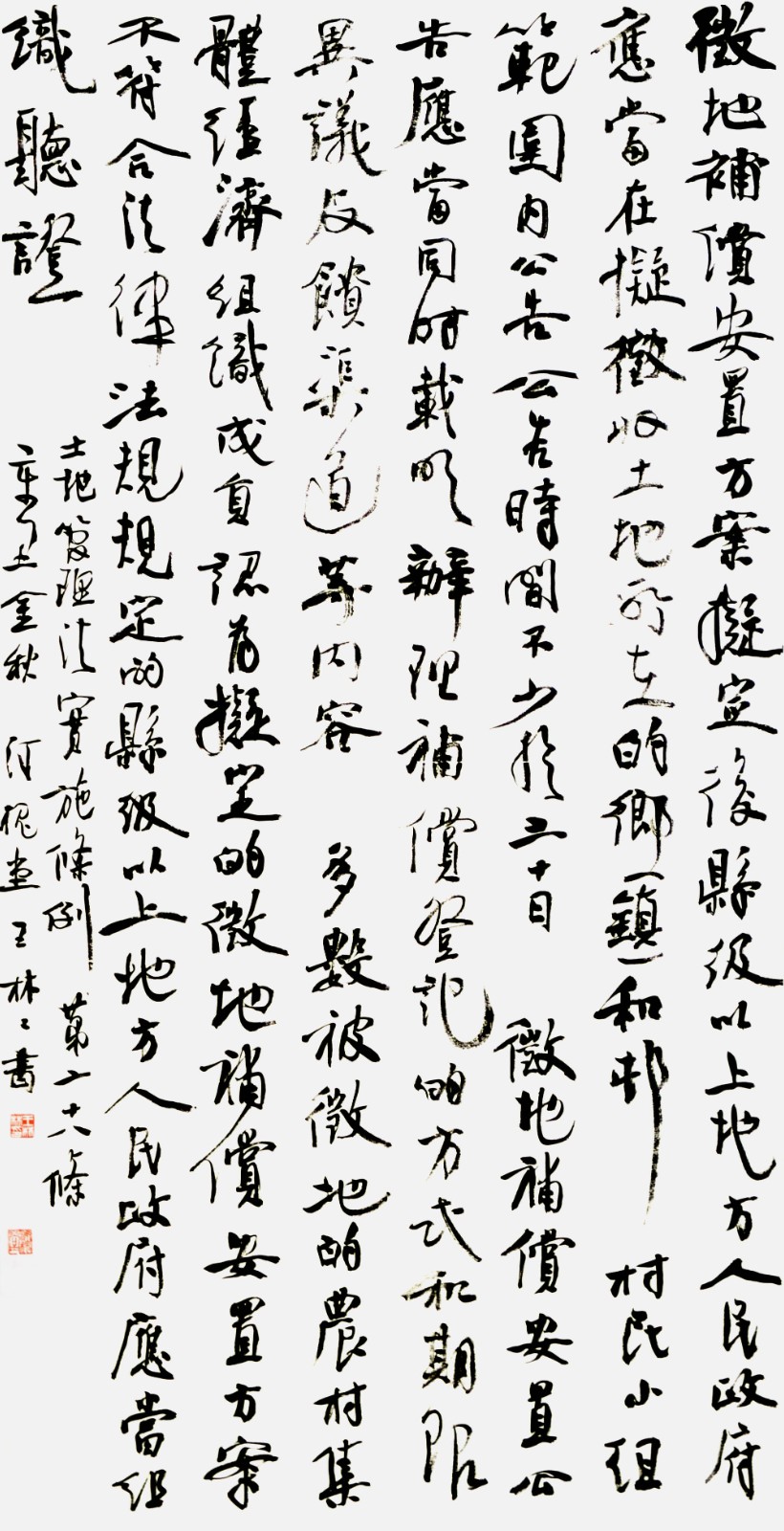 繼1600余位書法家參與書寫《中華人民共和國民法典》全部1260條法條之后,法治日報社聯(lián)合自然資源部法規(guī)司、自然資源部書畫研究會和北京昌平書法家協(xié)會,將筆端對準(zhǔn)土地管理“一法一條例”,即《中華人民共和國土地管理法》和《中華人民共和國土地管理法實施條例》。