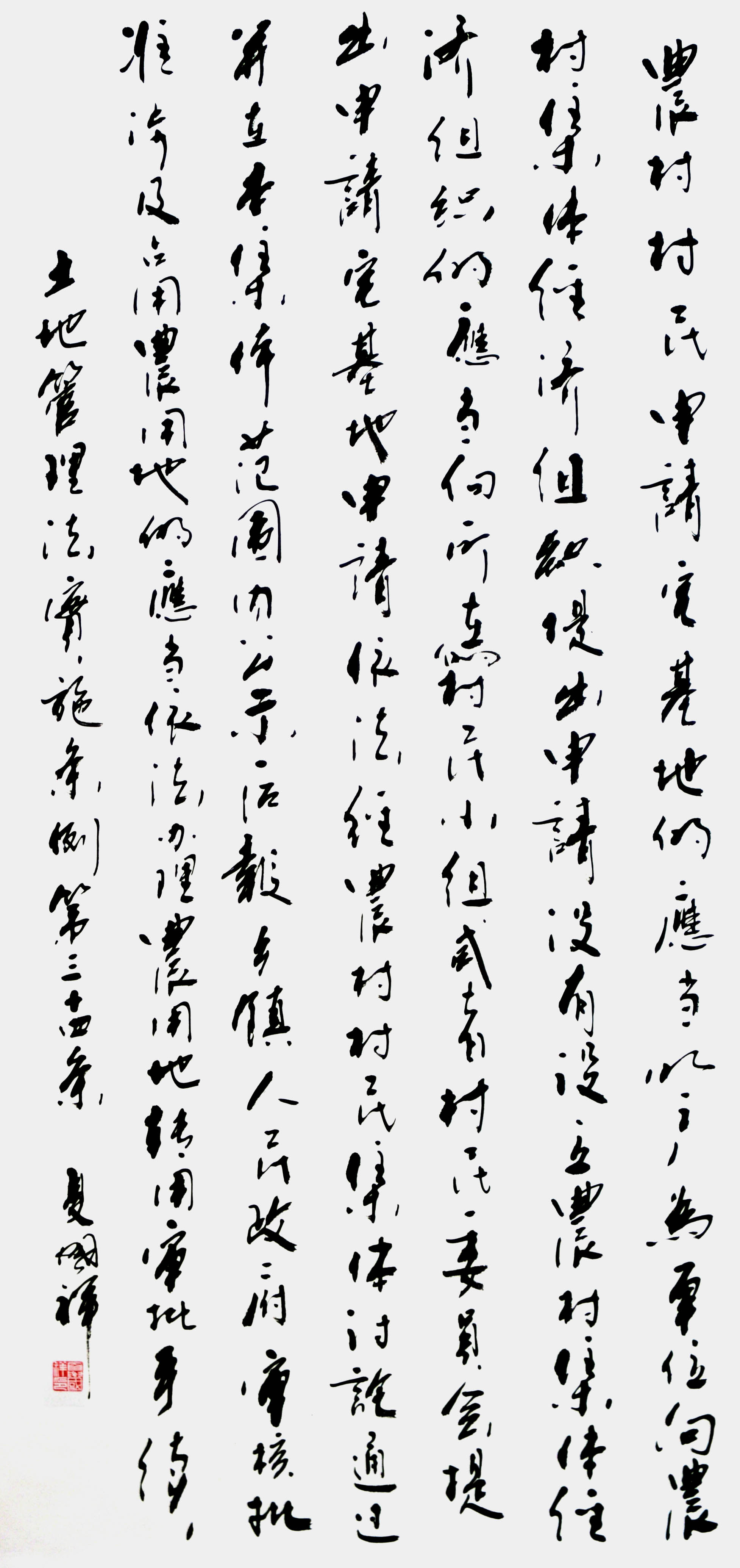 繼1600余位書法家參與書寫《中華人民共和國(guó)民法典》全部1260條法條之后,法治日?qǐng)?bào)社聯(lián)合自然資源部法規(guī)司、自然資源部書畫研究會(huì)和北京昌平書法家協(xié)會(huì),將筆端對(duì)準(zhǔn)土地管理“一法一條例”,即《中華人民共和國(guó)土地管理法》和《中華人民共和國(guó)土地管理法實(shí)施條例》。