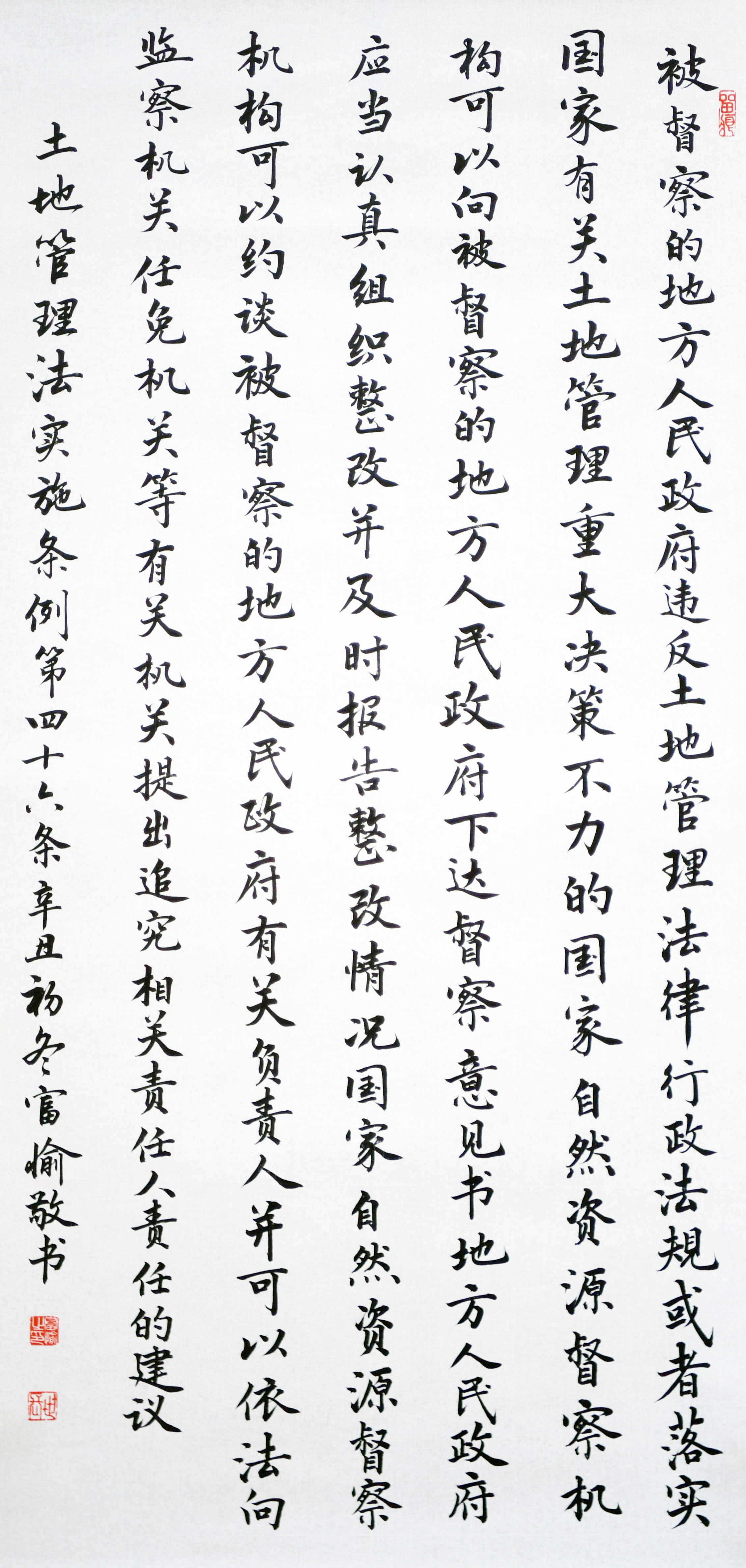 繼1600余位書法家參與書寫《中華人民共和國民法典》全部1260條法條之后,法治日報社聯(lián)合自然資源部法規(guī)司、自然資源部書畫研究會和北京昌平書法家協(xié)會,將筆端對準(zhǔn)土地管理“一法一條例”,即《中華人民共和國土地管理法》和《中華人民共和國土地管理法實施條例》。