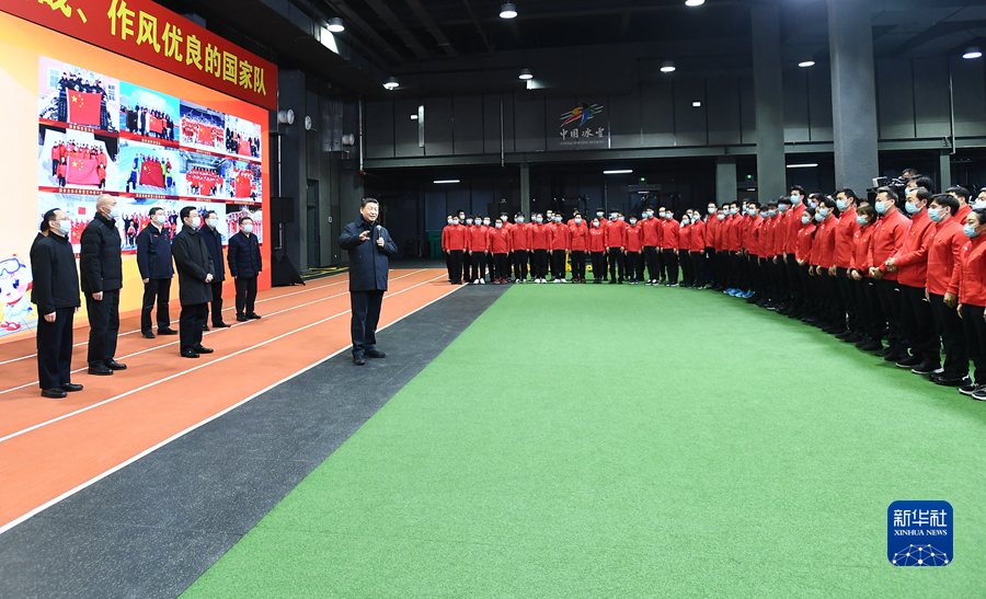 1月4日,中共中央總書記、國家主席、中央軍委主席習(xí)近平在北京考察2022年冬奧會、冬殘奧會籌辦備賽工作。這是4日下午,習(xí)近平在二七廠冰雪項目訓(xùn)練基地速滑館,向參訓(xùn)運動員、教練員表示慰問。新華社記者 謝環(huán)馳 攝