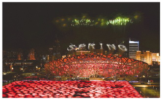 圖為開幕式上的焰火表演呈現(xiàn)出中英文“立春”和“spring”字樣。 新華社記者 邢廣利 攝
