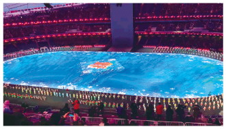 圖為在開幕式預(yù)熱環(huán)節(jié),一個(gè)“?!弊滞渡涞綀?chǎng)地中央。法治日?qǐng)?bào)全媒體見習(xí)記者 劉欣 攝