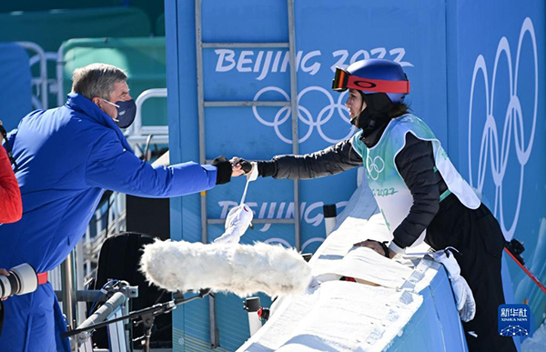 2月8日,國際奧委會主席巴赫(左)向中國選手谷愛凌表達祝賀。