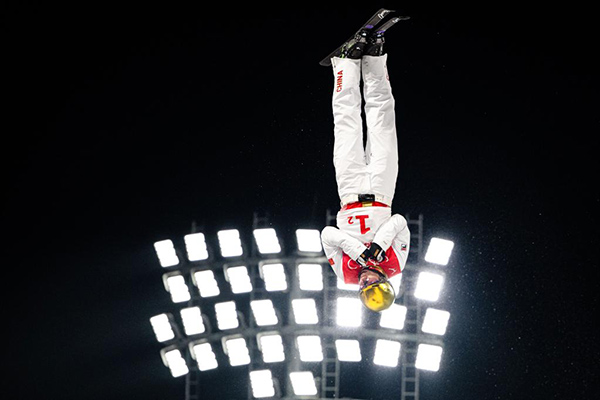2月10日,中國(guó)隊(duì)選手賈宗洋在北京冬奧會(huì)自由式滑雪空中技巧混合團(tuán)體決賽比賽中。新華社記者肖藝九攝