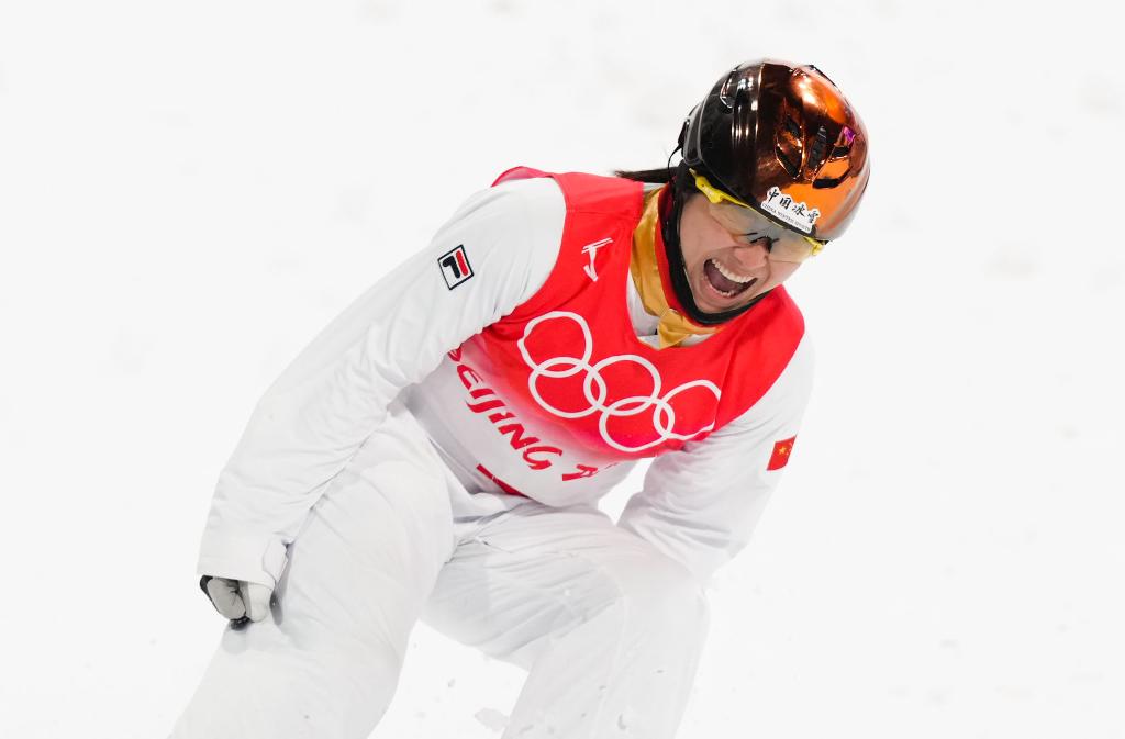 2月10日,中國(guó)隊(duì)選手徐夢(mèng)桃在北京冬奧會(huì)自由式滑雪空中技巧混合團(tuán)體決賽中慶祝。新華社記者薛玉斌攝