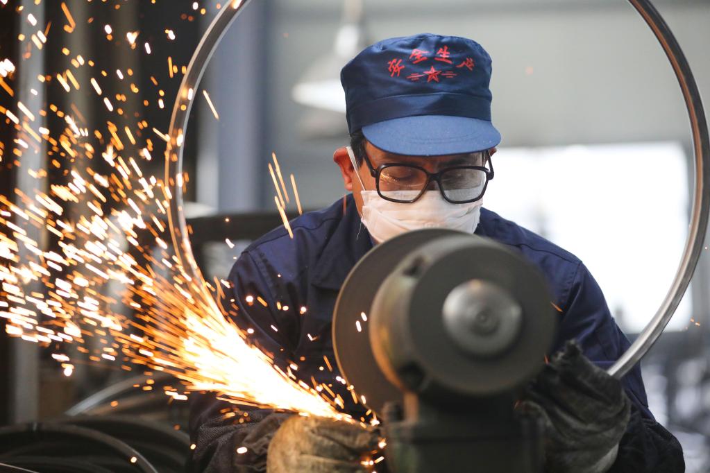2月7日,在浙江省杭州市臨安區(qū)天目山鎮(zhèn)一家外貿(mào)企業(yè),工人在拋光自行車鋼圈。新華社發(fā)(胡劍歡攝)