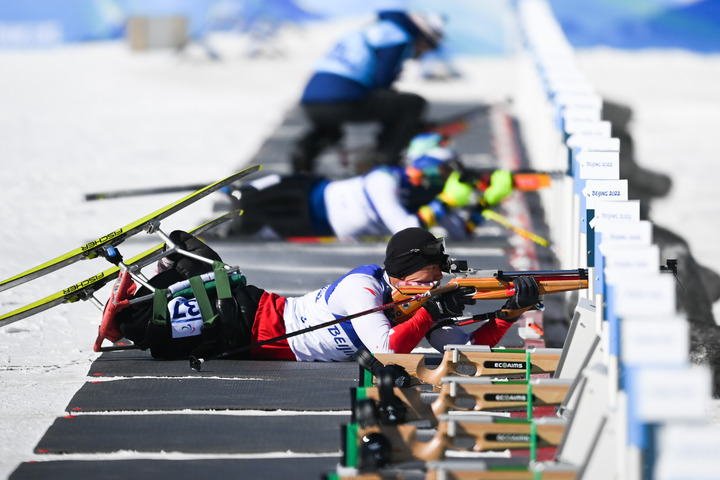 3月5日,中國選手劉子旭奪得北京冬殘奧會殘奧冬季兩項男子短距離(坐姿)比賽冠軍。新華社記者彭子洋攝